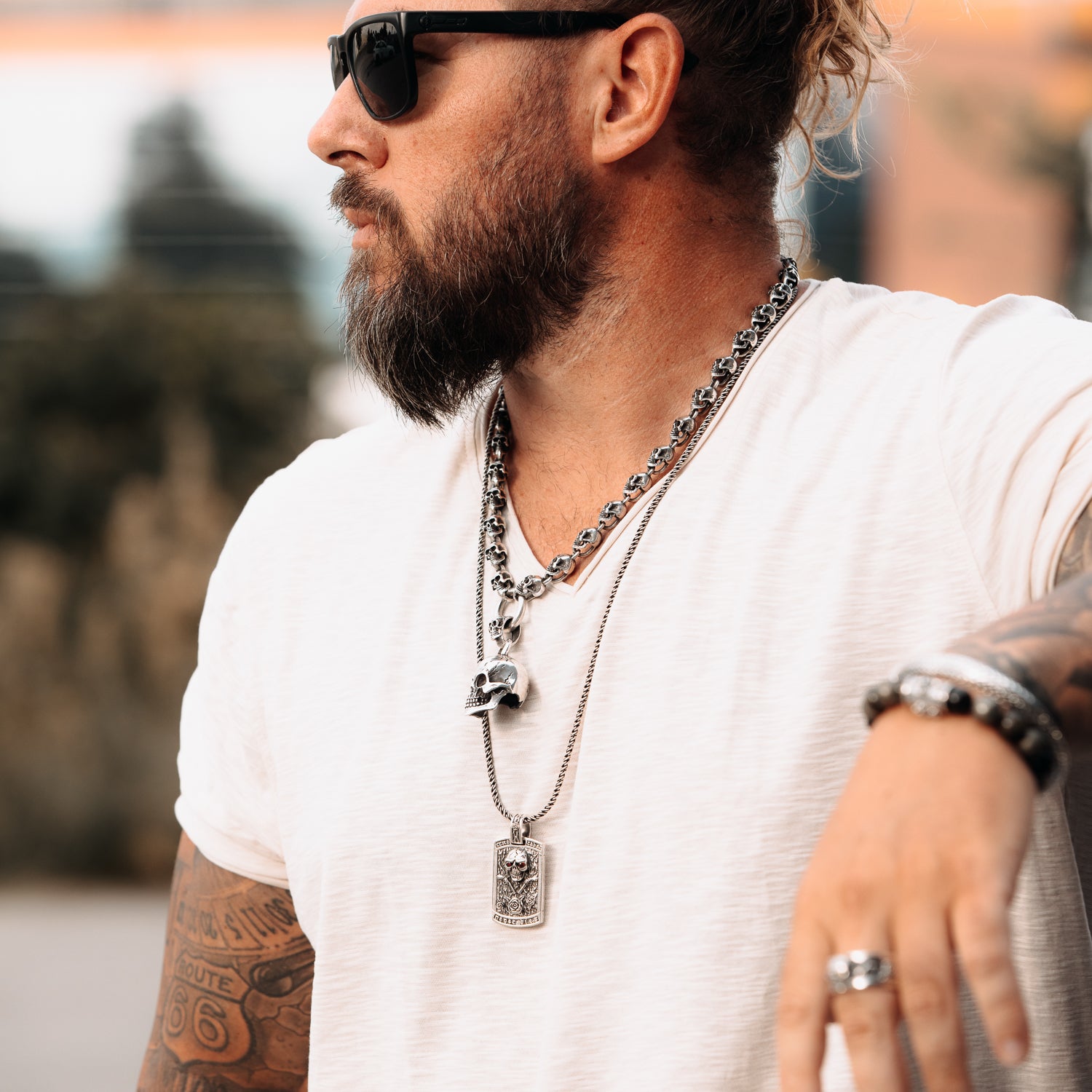 Dieser sehr massive Dog Tag Anhänger aus 925 Sterling Silber überzeugt mit einer eindrucksvollen Kombination aus Symbolik und meisterhafter Verarbeitung. Im Zentrum steht ein markanter Totenkopf, umgeben von kunstvoll gearbeiteten Rosen, Pistolen und feinen Ranken, die dem Design eine starke Ausdruckskraft verleihen. Jeder Bereich ist klar ausgearbeitet und erzeugt eine tiefe, strukturierte Optik, die sofort ins Auge fällt.