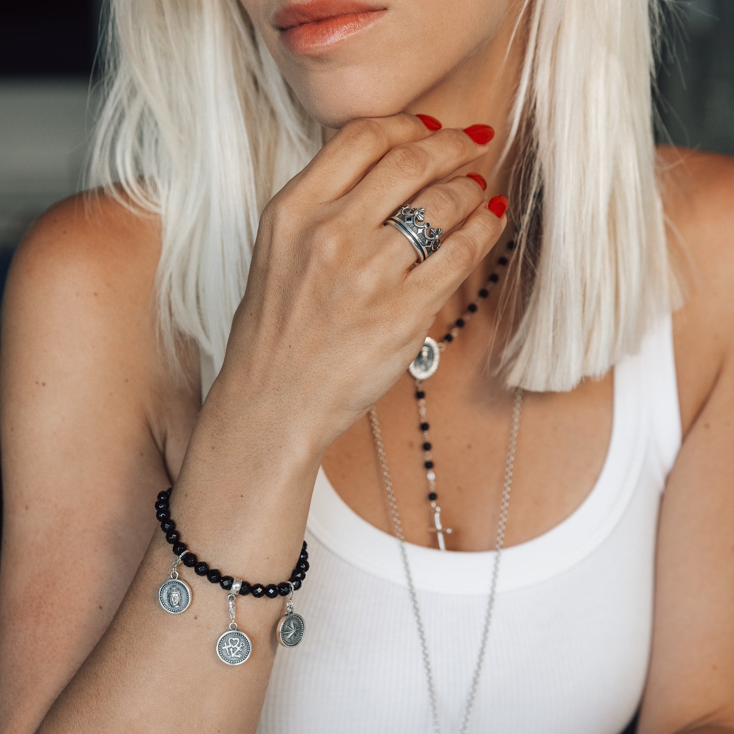 For royal styles: the unisex ring made of blackened sterling silver with a crown design. Incredibly detailed and decorated with dark zirconia stones, this silver ring is a piece of jewelry that many will respond to. The delicate workmanship underlines the exclusive character of the design. You don't need a throne to feel like a king or queen, just this ring!