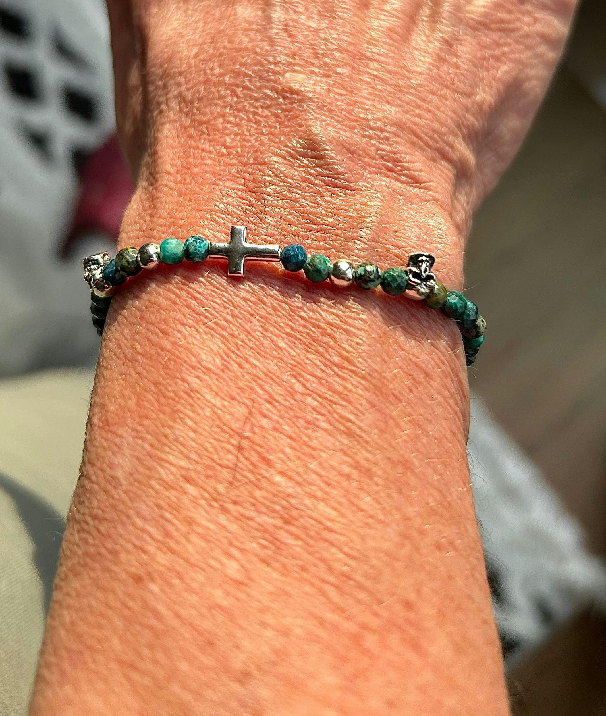Elastisches Armband aus facettiertem Chrysokoll mit Totenkopf und Kreuz Elementen