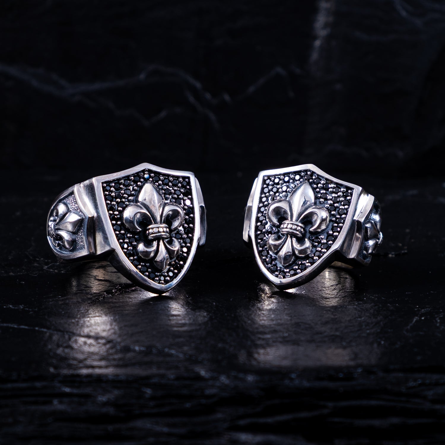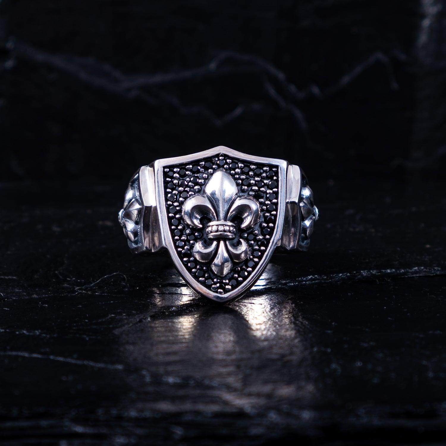 Dieser massive Siegelring überzeugt durch seine kraftvolle Präsenz und eine sehr plastische Ausarbeitung. Im Zentrum steht die markante Lilie, klar hervorgehoben und sauber vom pavégefassten Hintergrund aus Zirkonia abgesetzt. Die feine Steinsetzung verleiht der Oberfläche Tiefe und ein dezentes Funkeln.