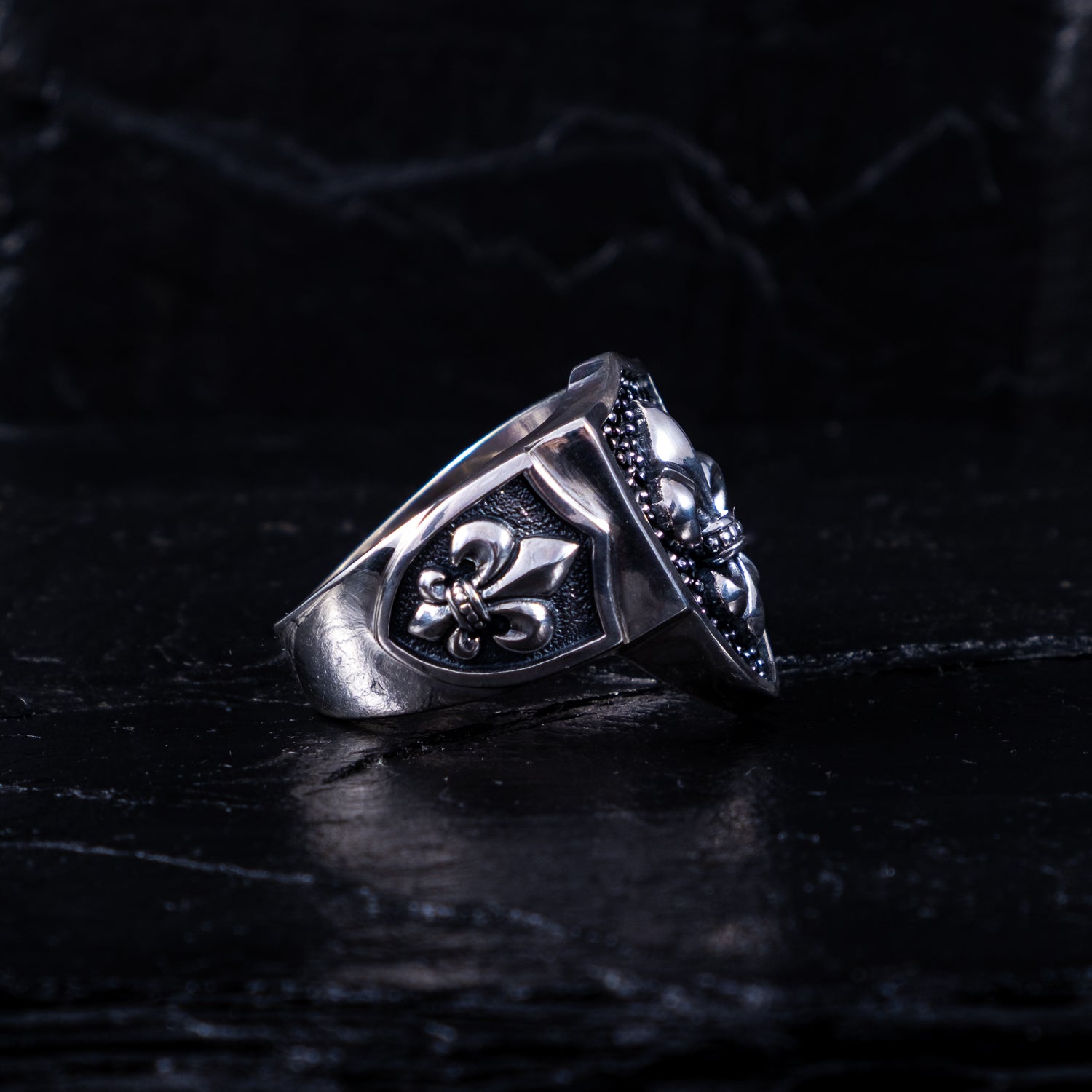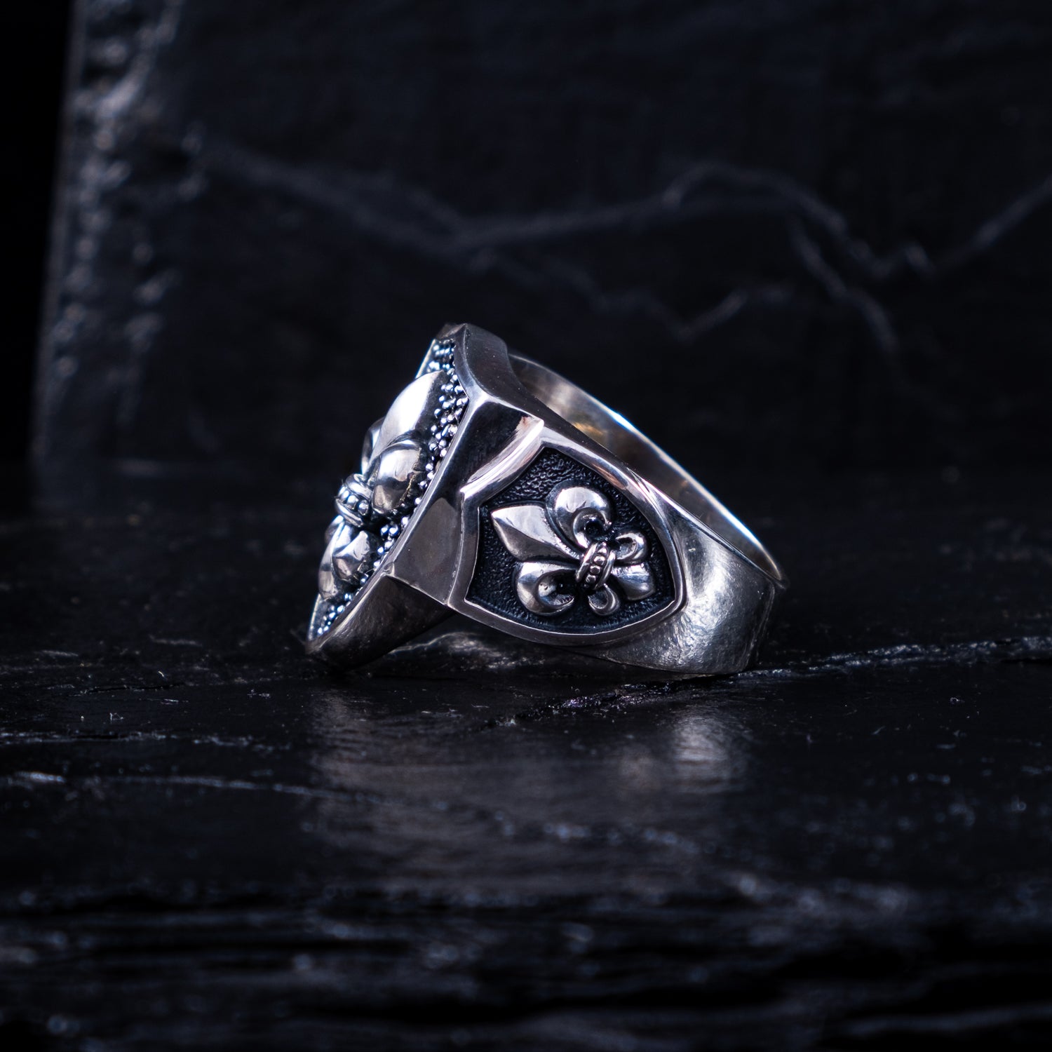 Auch seitlich wird das Design konsequent fortgeführt. Links und rechts der Ringschiene erscheint die Lilie erneut, präzise gearbeitet und harmonisch in die massive Form integriert. Klare Linien, strukturierte Flächen und der Kontrast zwischen Silber und Zirkonia sorgen für einen edlen, zeitlosen Look.