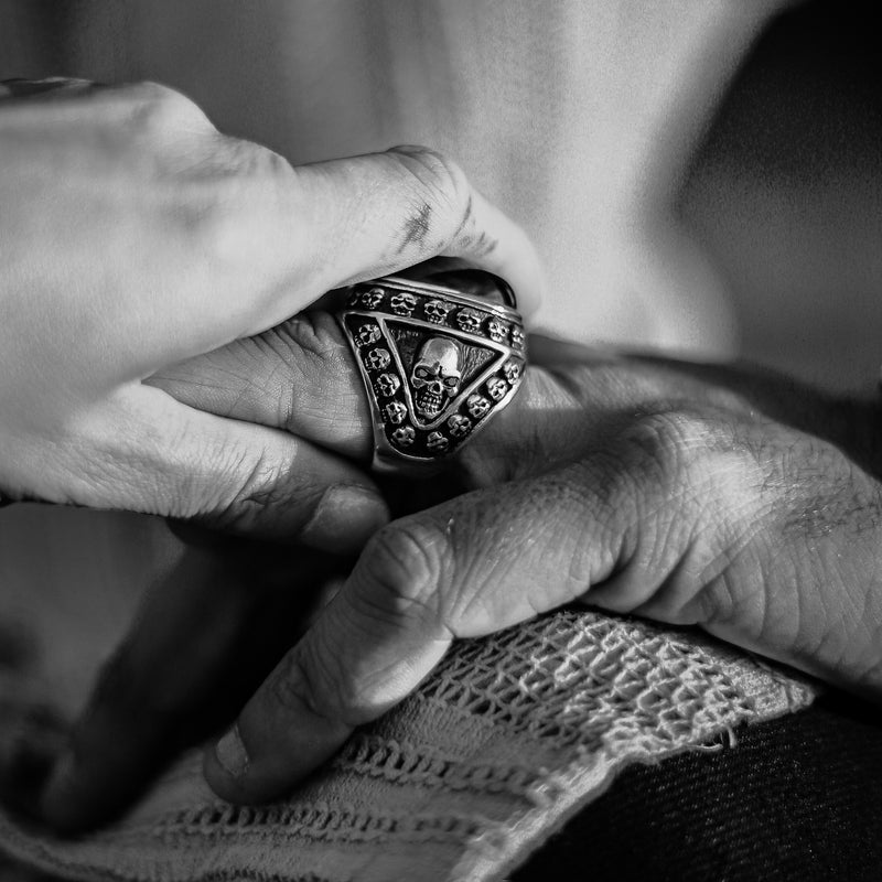 Jedes Modell wird aus massivem Silber gefertigt und trägt die Handschrift echter Handarbeit. Strukturen, Reliefs, geschwärzte Akzente und präzise Details machen jeden Herrenring zu einem einzigartigen Statement-Piece.